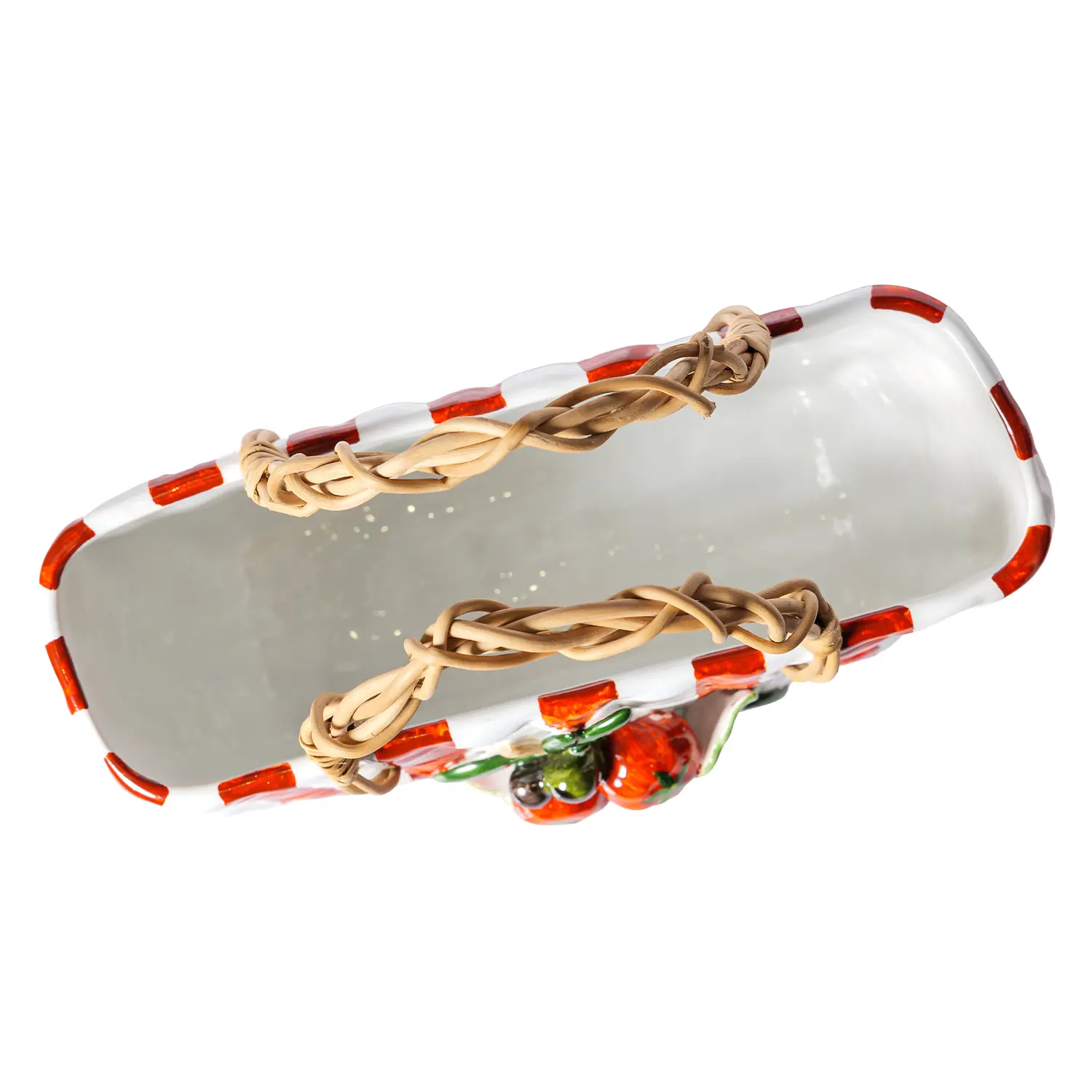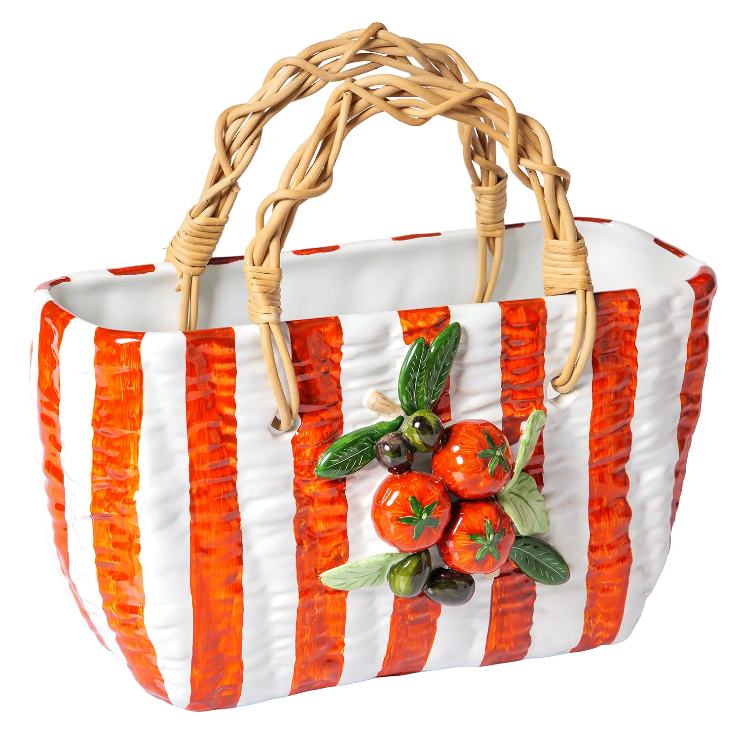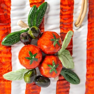 Inspirada no estilo mediterrâneo e nas feiras italianas, a peça combina o formato de uma bolsa com o universo da mesa posta, trazendo listras vibrantes em vermelho e branco, alças em trama natural e um delicado relevo de tomates e folhas no centro. O resultado é um design inesperado e encantador, que mistura humor, sofisticação e identidade.